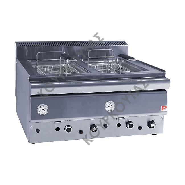 Φριτέζα αερίου με δύο κάδους, χωρητικότητας 8 + 8 λίτρων λαδιού, με δύο θερμοστάτες και δύο θερμόμετρα